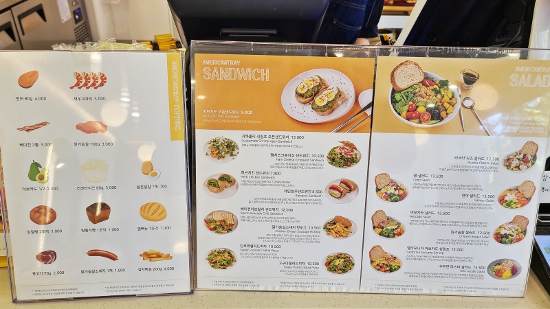 샌드위치와 샐러드가 주 메뉴이며, 추가적으로 토핑 그리고 빵도 슬라이스로 따로 주문이 가능해요.