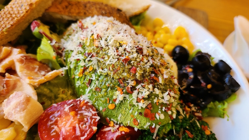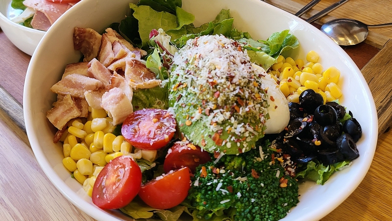 아메리칸트레이 메뉴중 아보카도 샐러드는 아보카도가 정말 작은 덩어리가 아니고 큰 덩어리 반개가 들어있습니다.