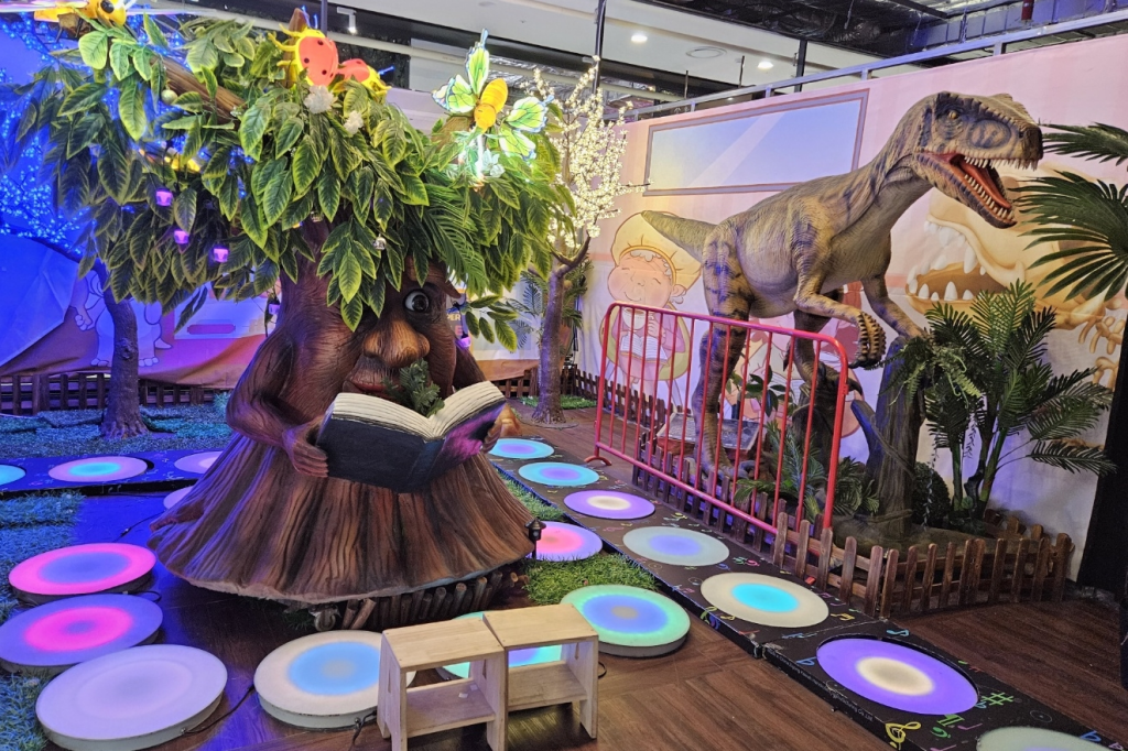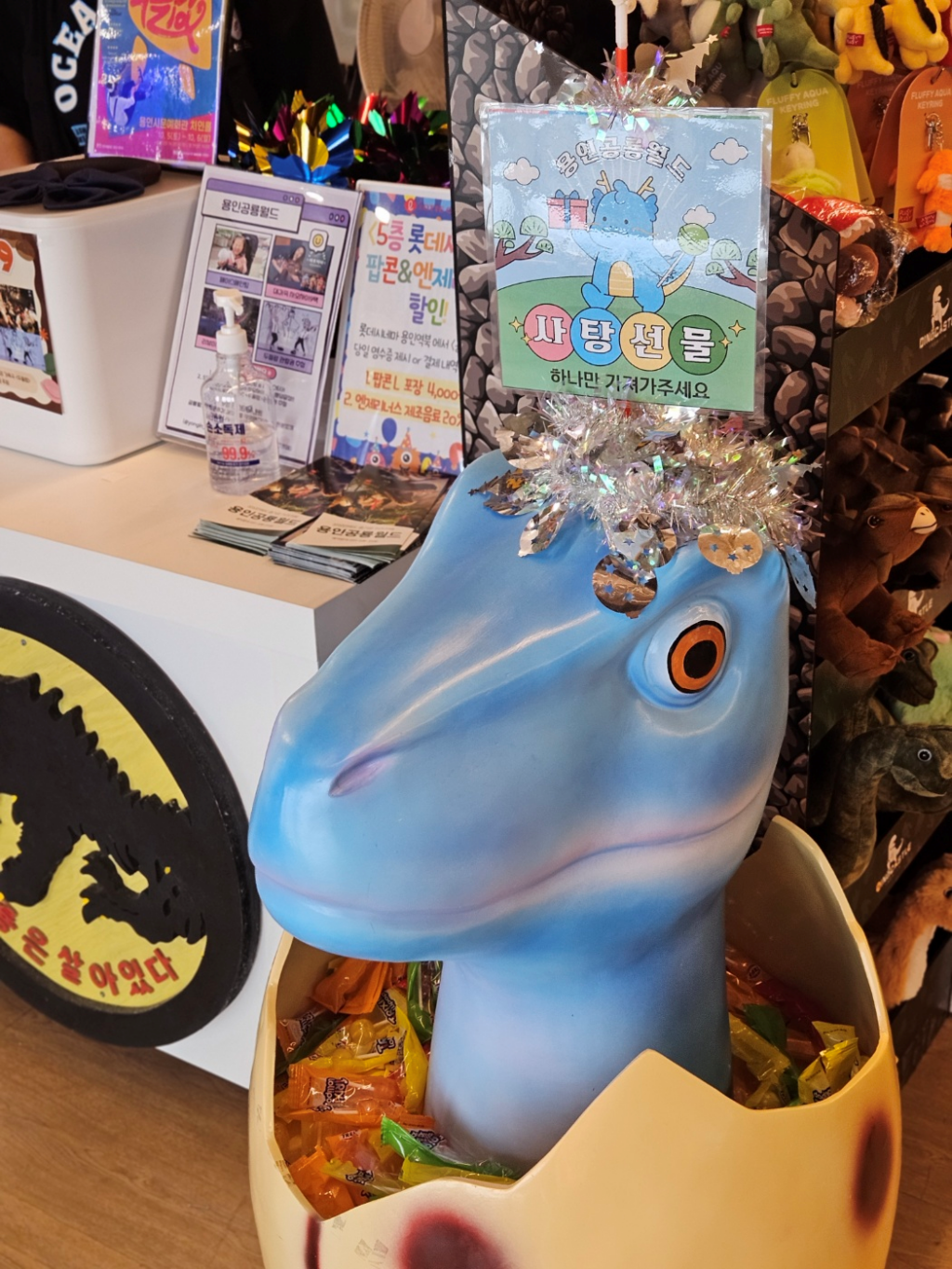 먼저 4층에 올라오시면 용인 공룡월드 매표소가 있습니다. 매표소에서 입장료 결제 후에 입장하시면 되고, 입장하실 때 매표소 바로 옆에 사탕선물이 있으니 하나 챙기시고 바로 공연장으로 가는 것을 추천드립니다.