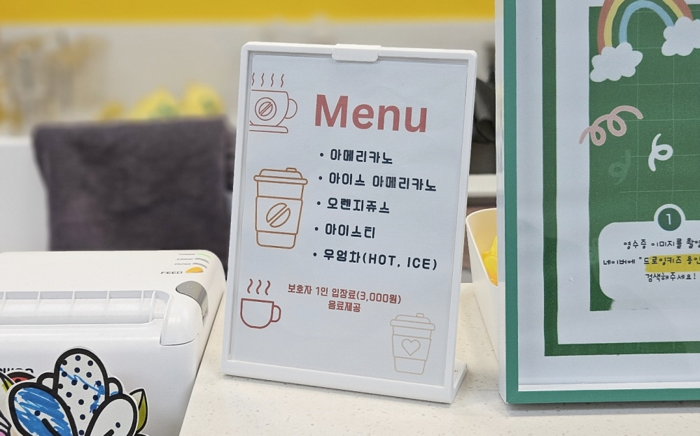 보호자 입장료 3,000원에는 음료비용이 포함되어 있어 위 메뉴 중에서 아무거나 고르실 수 있습니다. 그리고 현재 네이버리뷰 이벤트 중이어서 영수증 출력 후에 네이버 리뷰를 남기면 아이음료를 1개 증정해주고 있습니다. 영수증 1개당 1개 가능하기 때문에 방문하실 때마다 중복으로 이용이 가능하기 때문에 아이음료 필요하신 분들은 리뷰 이벤트 참여해도 좋을 것 같아요. 아이음료는 뽀로로음료와 보리차 그리고 팩 음료 등이 있어 다양하게 준비되어 있었습니다.