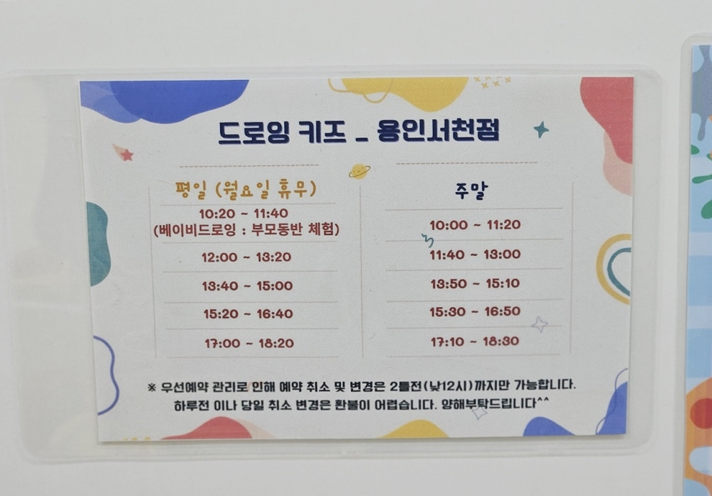 - 예약문의: 010-3510-7958 또는 카카오톡 채널 드로잉키즈 용인서천