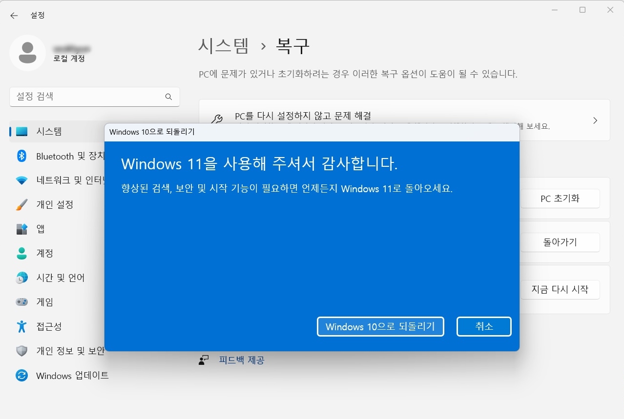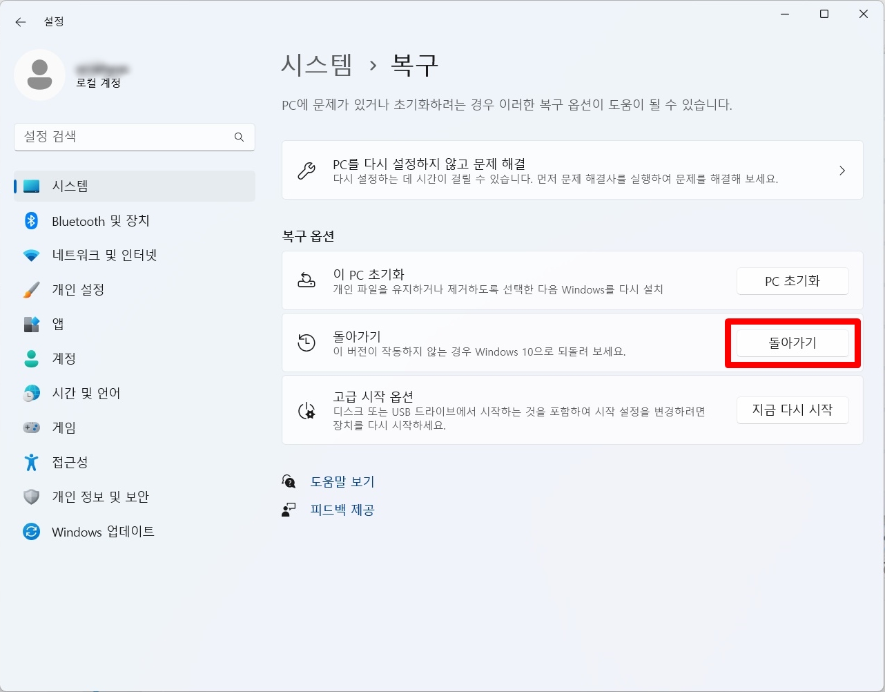 | [돌아가기] 버튼을 클릭하면 윈도우가 윈도우10으로 되돌아가 현재 윈도우11 시스템을 이전 윈도우10 시스템으로 되돌릴수 있습니다. |