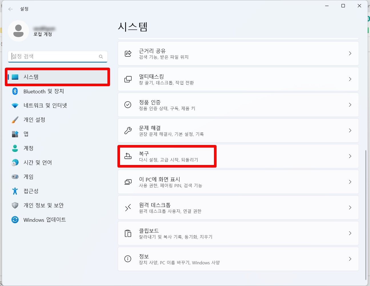 | 2) 왼쪽 시스템을 눌려주신 후 우측 화면에 복구 버튼을 클릭 해 준 후 복구 옵션에 돌아가기 버튼을 클릭하여 줍니다. |