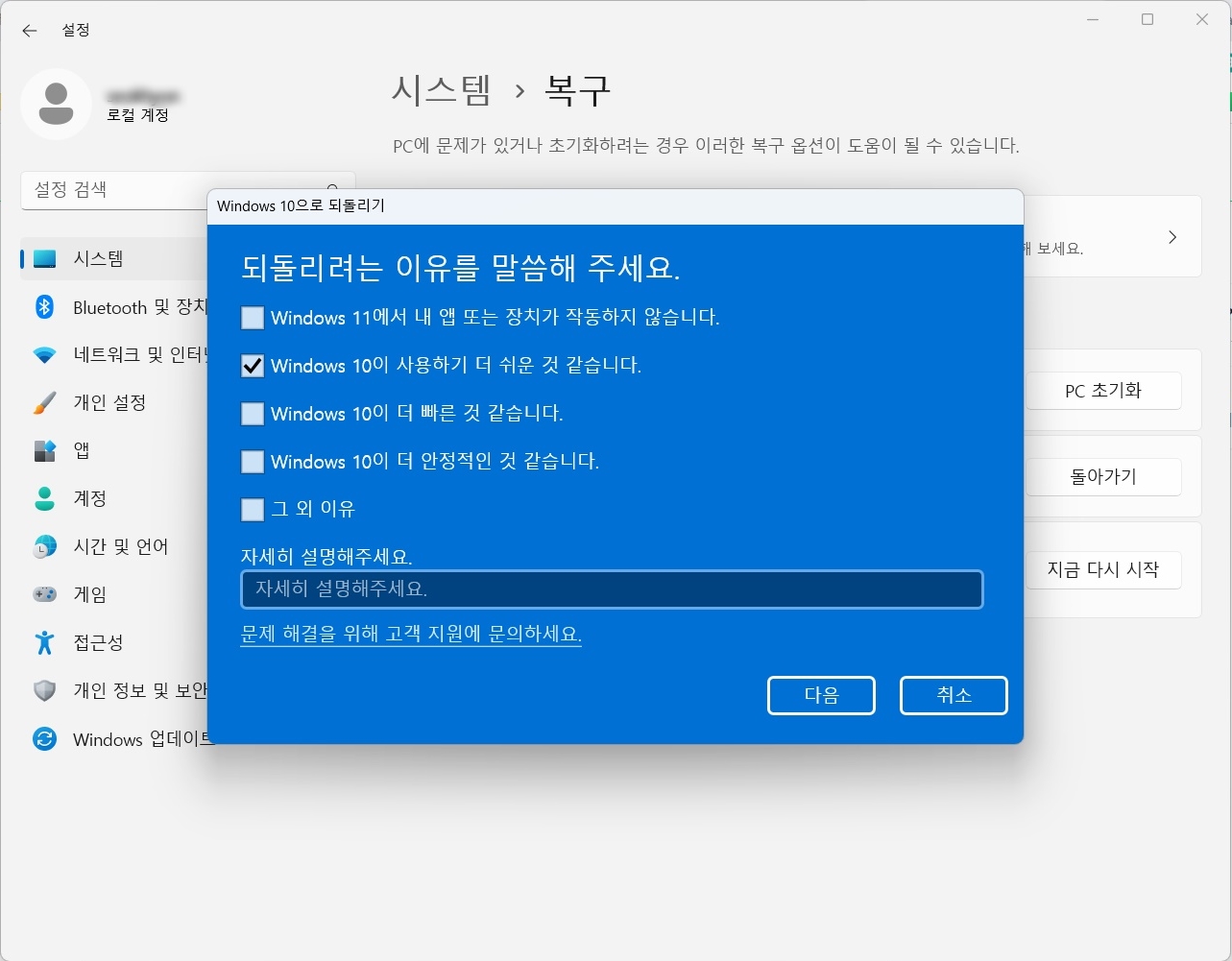 | 3) 윈도우 11에서 윈도우10 다운그레이드하는 이유를 물으며 아래와 같은 순서대로 진행해 주시면 끝. |