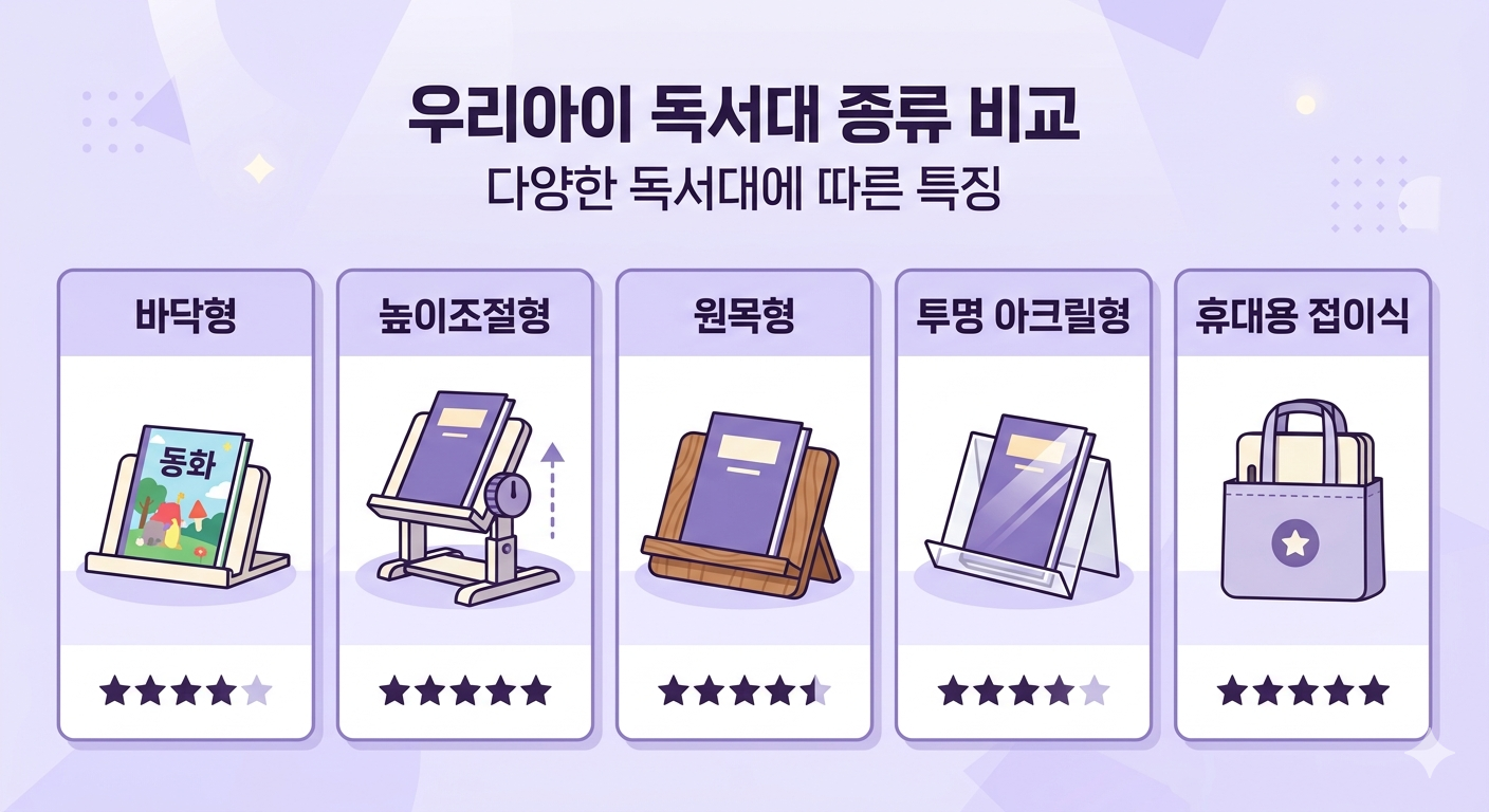 유아 독서대는 소재·형태·사용 방식에 따라 크게 5가지 유형으로 나뉩니다. 아래 비교표로 한눈에 확인하세요.