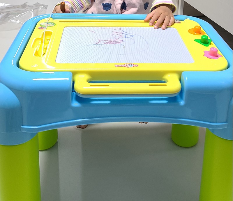 이 제품을 추천드리는 이유가 조립식 테이블이라 아이가 앉아서 또는 서서 안정적으로 놀기 좋고, 상판을 뒤집으면 칠판 드로잉 보드로 활용할 수 있기 때문이에요. 상단 패널에는 피아노와 멜로디 사운드 놀이 기능이 들어 있어 아이가 지루할 틈이 적습니다.