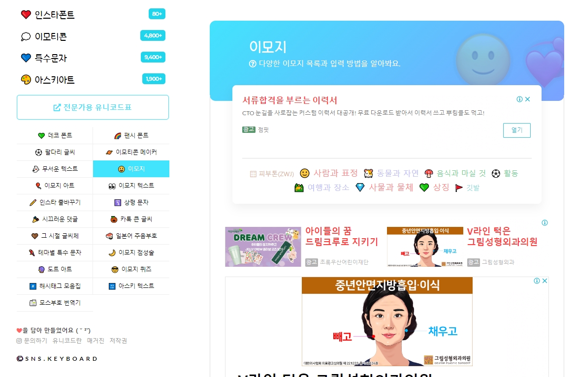 SNS Keyboard는 SNS와 채팅에서 쓸 수 있는 특수문자 이모티콘 목록과 복사 기능을 제공하는 온라인 사이트 입니다,