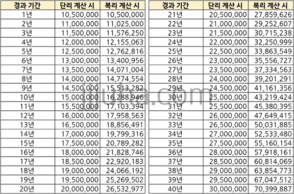 아래 예시를 보면 위에서 든 예시와 동일한 조건으로 저축 기간을 장기화시켰을 때의 복리효과를 확인할 수 있으며, 복리의 진짜 힘은 시간이 더해졌을 때 나오게 된다는 것을 확인하실 수 있습니다.