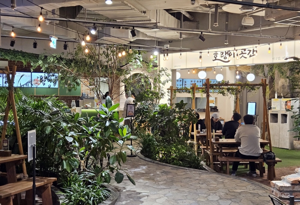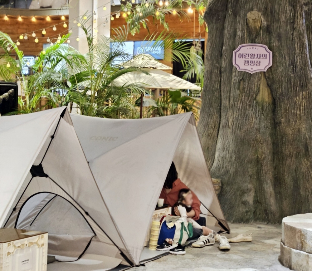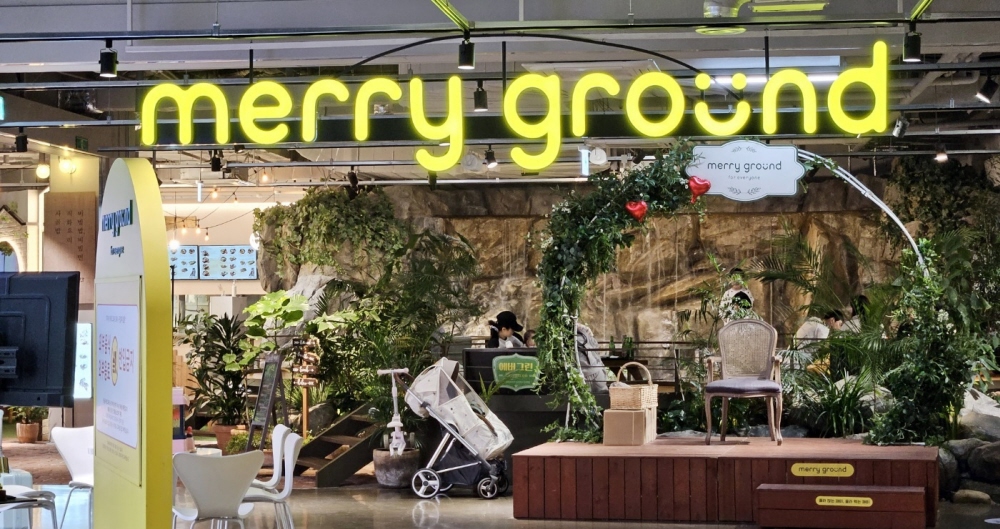 지하 1층에는 메리그라운드가 있는데 이곳은 식당가예요. 식당가인데 굉장히 특이했던 게 캠핑느낌으로 존이 꾸며져 있어서 식당에서 메뉴를 주문한 뒤 원하시는 자리에 앉아서 식사를 하실 수 있습니다. 아기의자도 비치되어 있고 마치 캠핑을 즐기며 식사를 하는 즐거움을 느끼실 수 있습니다.