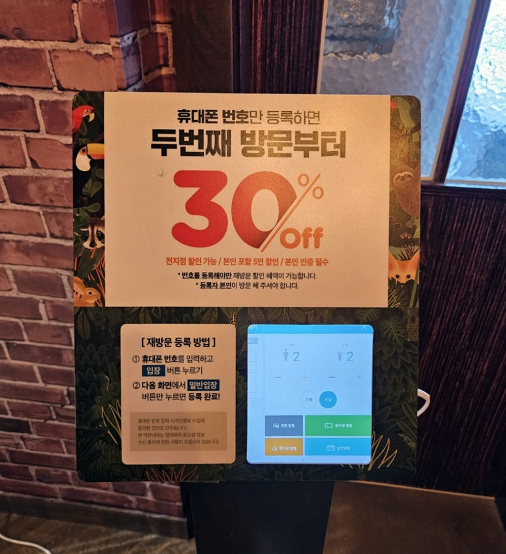 나가실 때 위 이미지처럼 입력하는 란이 있는데 꼭 입력해 주고 나가시면 돼요. 다음이용 시에 30% 할인된 금액으로 이용하실 수 있습니다. 이게 동탄점만 적용되는 게 아니고 전 지점이 적용된다고 하니 지인 지역으로 놀러 갔을 때 주렁주렁 매장이 있다면 유용하게 쓰이겠더라고요.