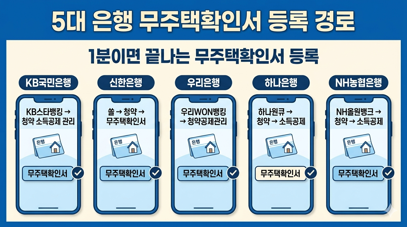 무주택확인서는 거래 은행 앱·인터넷뱅킹·창구 어디서든 발급할 수 있습니다. 2026년 현재는 모바일 앱 1분 등록이 표준입니다.