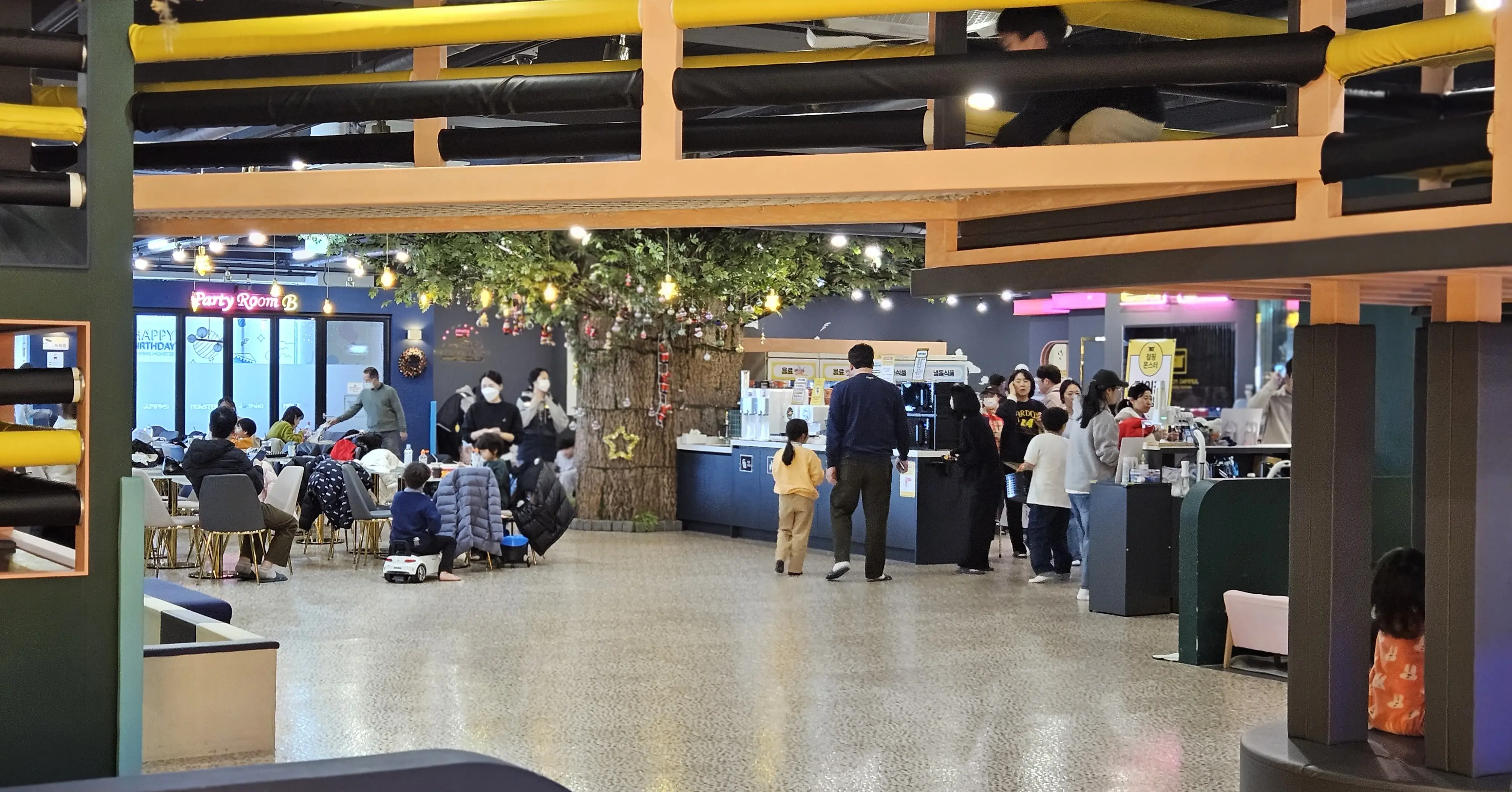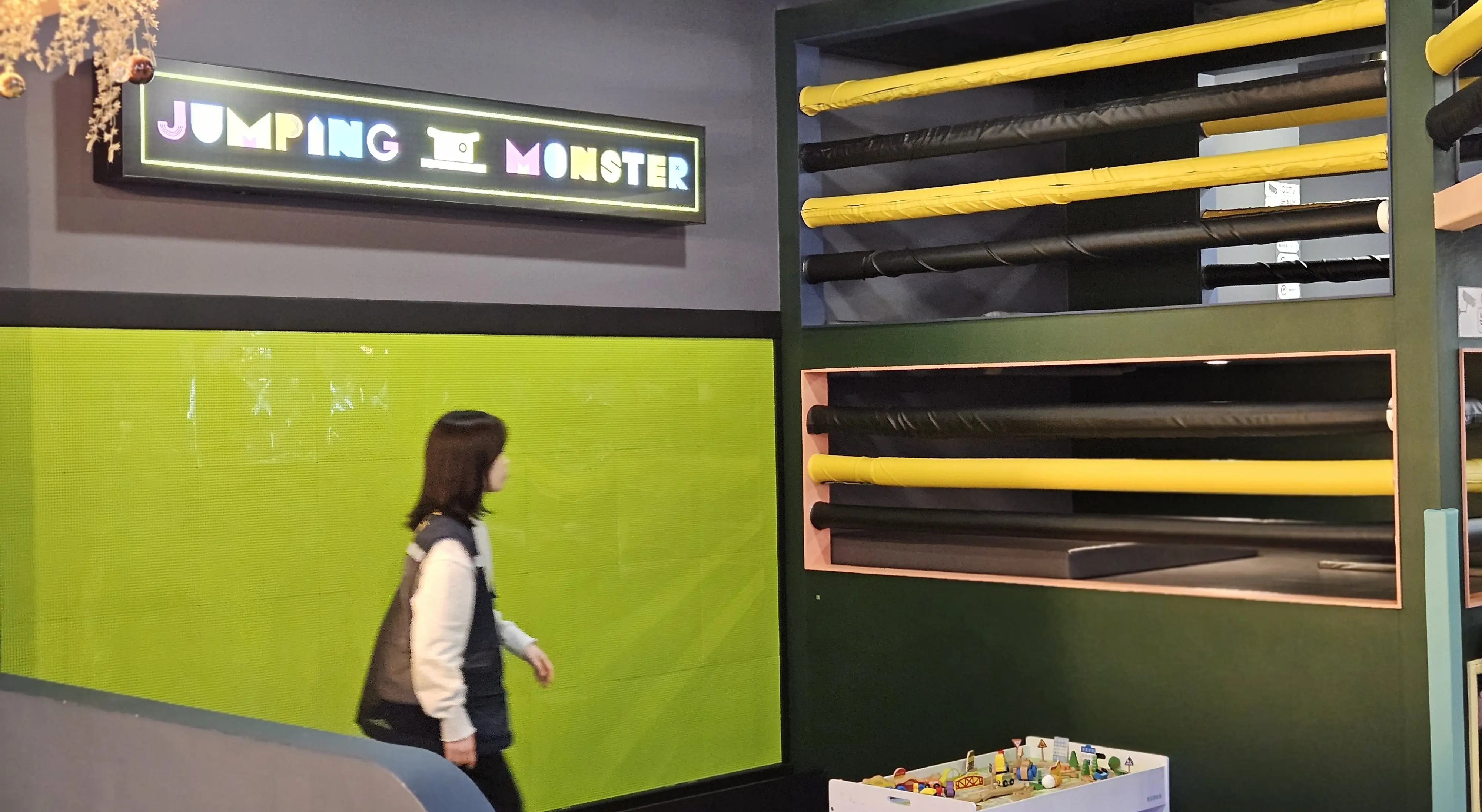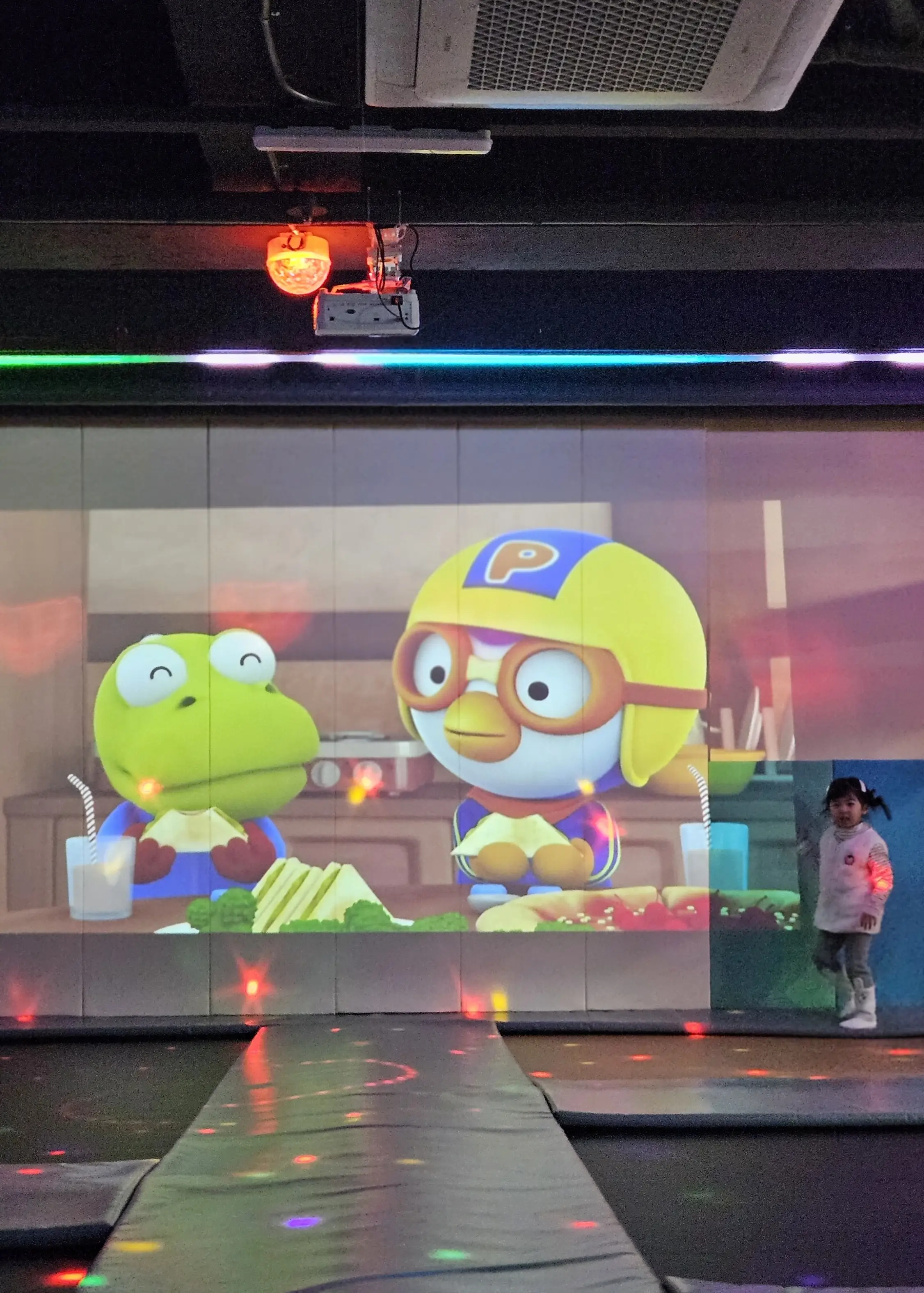 넓은 공간에서 마음껏 뛰어놀 수 있는 트램펄린 존! 아이들의 체력을 소진시키기에 딱 좋은 곳으로, 보호자들도 함께 즐길 수 있는 곳인데요 대형 스크린이 있어 더욱더 재미있게 스크린을 보며 즐겨 놀았어요!