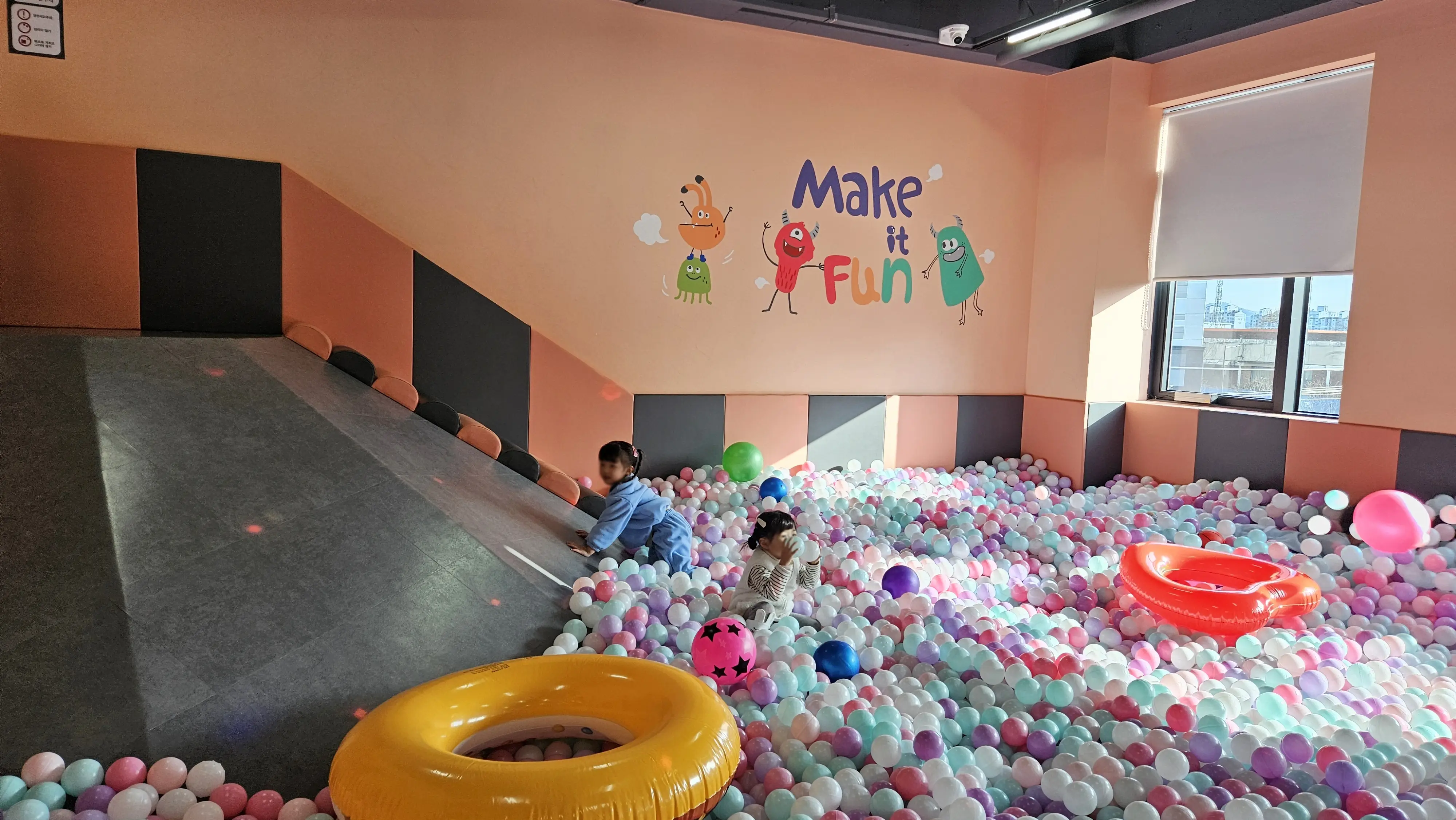 다양한 색상의 공이 가득한 볼풀장에서 아이들은 시간 가는 줄 모르고 즐길 수 있습니다. 볼풀 속에서 숨바꼭질을 하거나 공을 던지면서 놀 수 있어 인기 만점! 그리고 곳곳에 탈 것들과 튜브가 있어서 주변의 기구들을 가지고도 재미있게 놀았습니다!