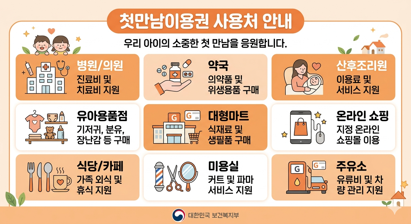 출생아 1인당 200만 원(둘째 이상은 300만 원)을 국민행복카드 바우처로 지급하는데, 막상 카드를 받고 나면 어디서 쓸 수 있는지, 반대로 안 되는 곳은 어딘지 헷갈리는 경우가 많습니다. 이 글에서는 첫만남이용권 사용처를 업종별로 구체적으로 정리하고, 사용 불가 업종과 유의사항, 그리고 실제로 많이 쓰이는 활용법까지 안내해 드립니다.