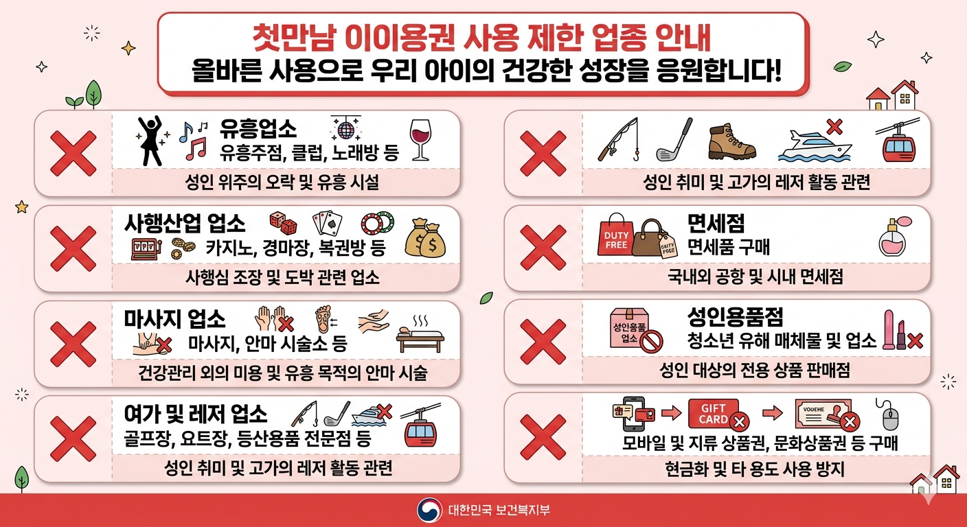 첫만남이용권은 출산 가정의 양육비 지원이 목적인 만큼, 지급 취지에서 벗어난 일부 업종에서는 결제가 차단됩니다. 아래 업종에서는 국민행복카드로 결제를 시도해도 승인이 거절됩니다.