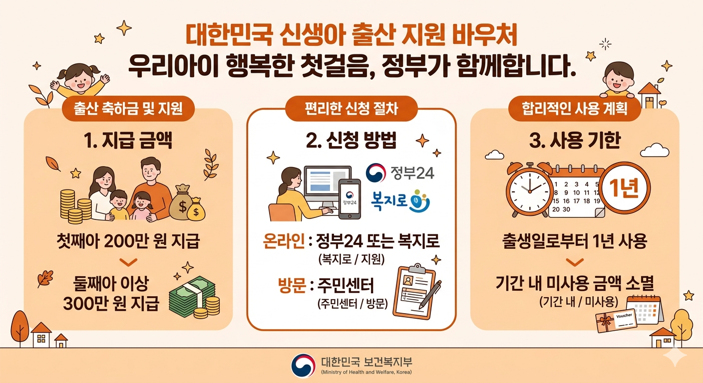 | 지원 금액 | 첫째아 200만 원 / 둘째아 이상 300만 원 (2024년 1월 1일 이후 출생아부터) |