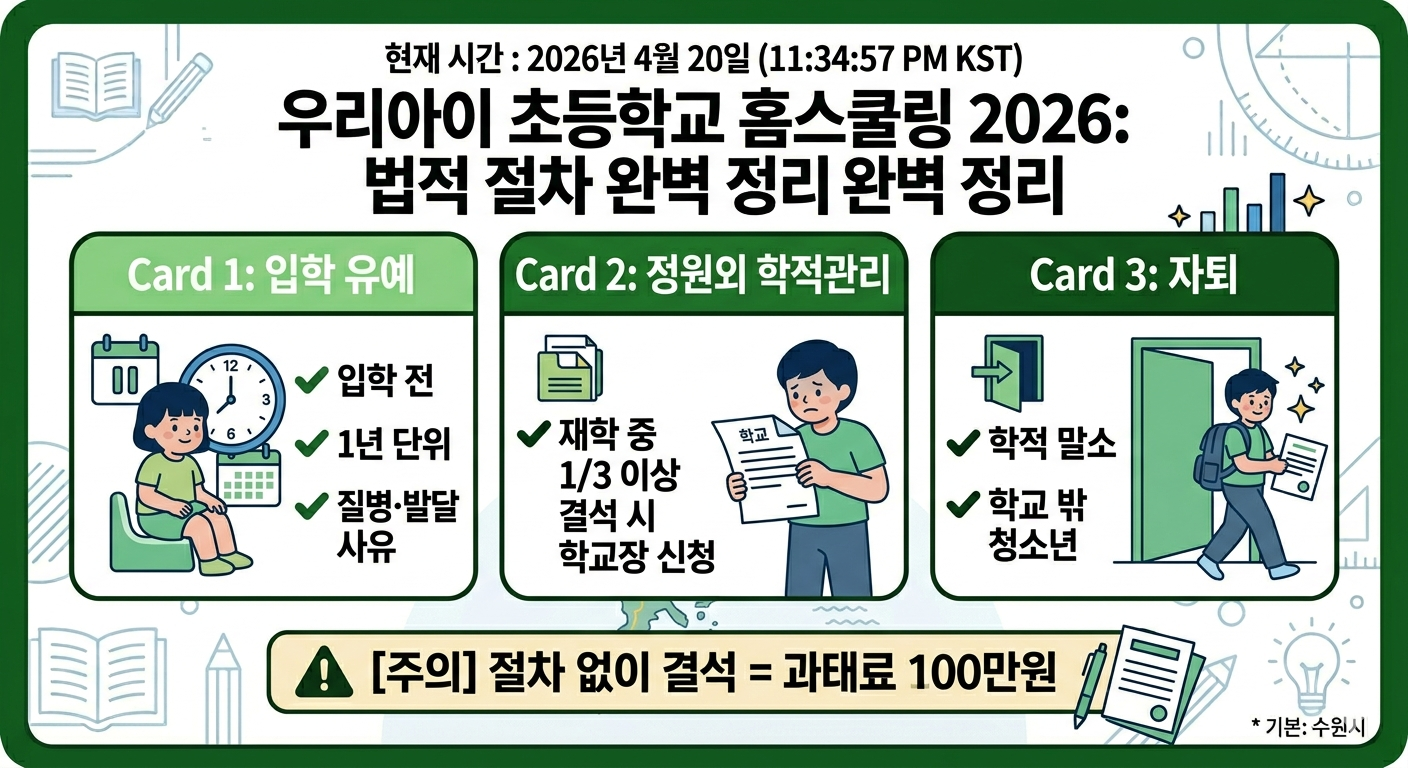 이 글에서 2026년 기준 초등학교 홈스쿨링의 법적 근거, 취학 유예·정원외 학적관리 절차, 초졸 검정고시, 꿈드림 지원 서비스, 중학교 진학 방법까지 정리해 드립니다.