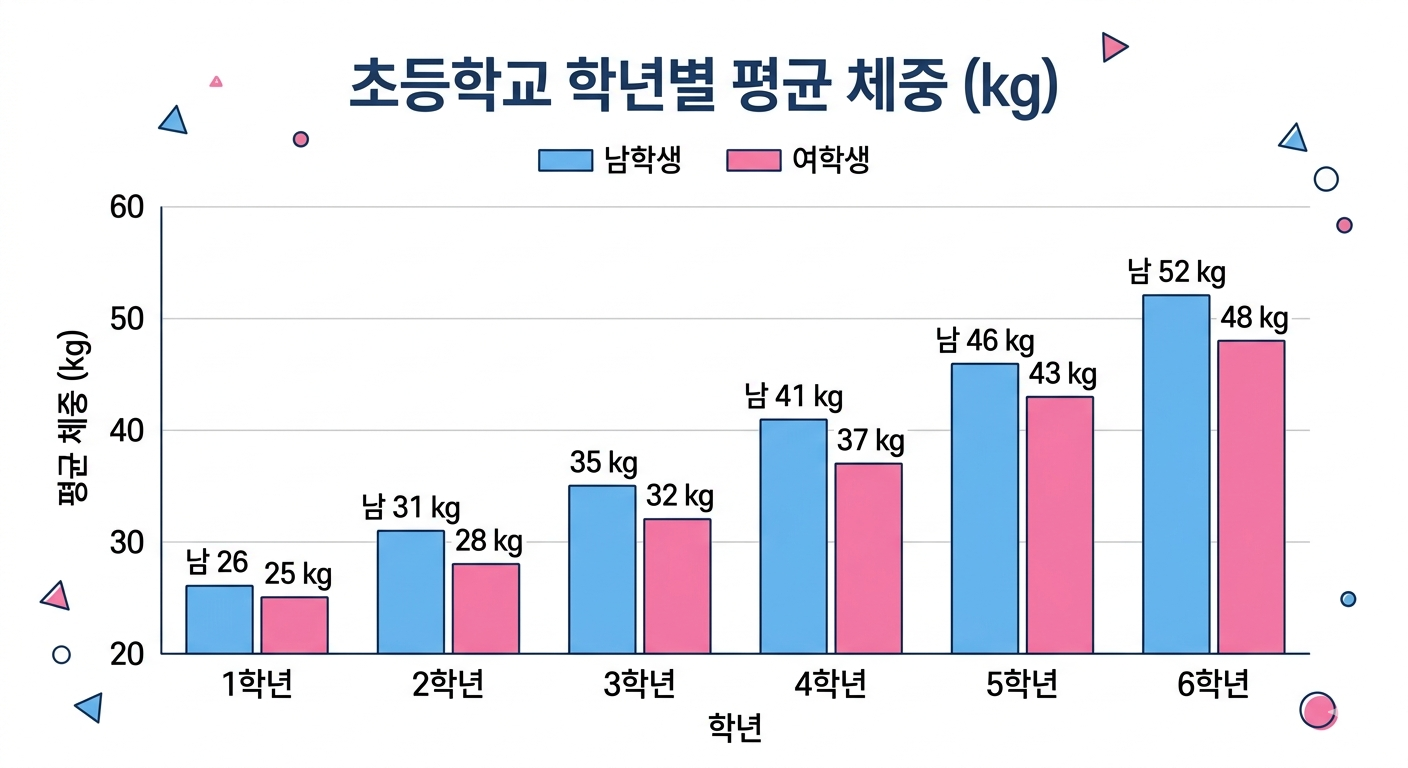 | 1학년 | 약 26.2 | 약 24.6 | 남녀 차이 약 1.6kg |