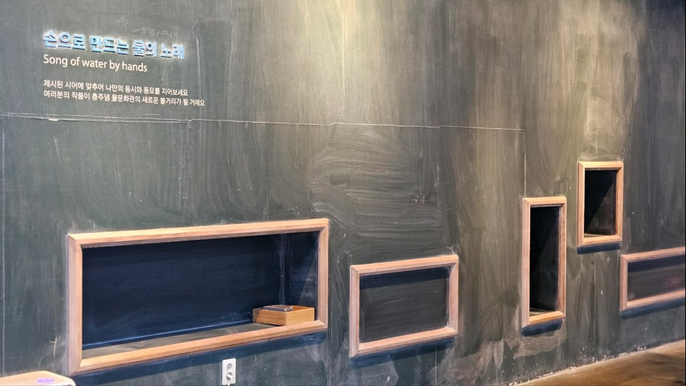 충주댐 물문화관 내부에는 굉장히 다양하게 아이들의 놀거리들이 제공되고 있는데요. 특히 위에 보이는 공간인 손으로 만드는 물의 노래는 칠판으로 이루어져 있어 아이들이 손으로 그려보는 재미있는 놀이처럼 할 수 있어요.