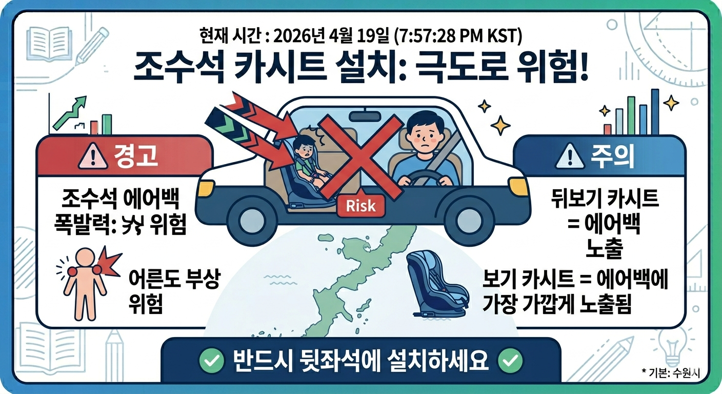 앞보기로 설치하더라도 조수석 에어백이 아이의 얼굴·가슴 방향으로 전개되기 때문에 마찬가지로 위험합니다.