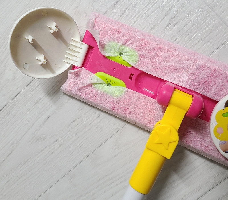 기능이 많진 않지만 아이가 좋아하고 자주 놀거나 흥미를 느끼는 요소들이 잘 들어 있어요. 굉장히 놀랐던 게 아기 청소기 장난감이라고 해서 작동이 안 되는 게 아니고 어른 청소기랑 그냥 스펙이 똑같다고 보시면 되겠더라고요. 저의 경우 집에서 사용 중인 부직포를 해드 부분에 꽂아서 사용하게 해 주니 진짜 먼지들이 다 달라붙는 겁니다. 사용방법도 모서리 부분에 부직포를 고정해서 하는 거고요!