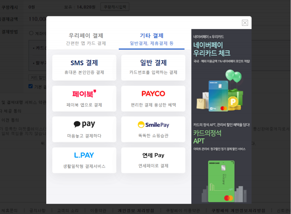 또한 쿠팡은 스마일페이, 삼성페이, 엘페이 등 다양한 간편결제도 지원하므로 쿠팡 간편결제 방식은 카드 종류와 상관없이 활용도가 높은 방법입니다.