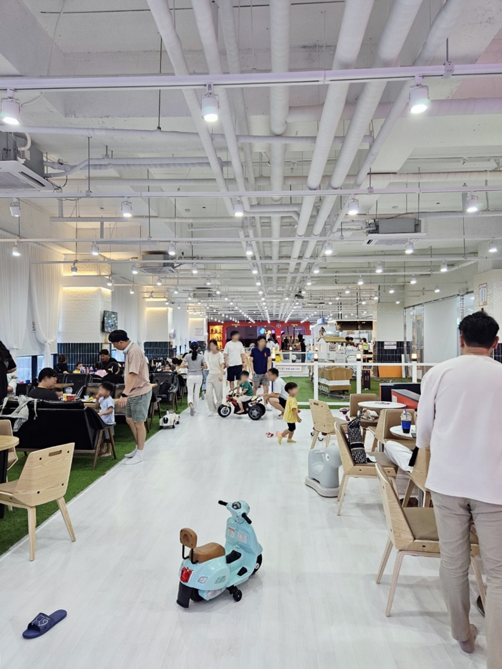 대형키즈카페답게 굉장히 큰 규모를 자랑하는데요 한 층을 다 사용하더라고요. 공간이 넓은 만큼 아이가 탈 것들이 많이 준비되어 있었고 매장 내에서 탈 것을 이용하여 이동할 수도 있었습니다. 붕붕카들도 보이지만 전기 모터로 움직이는 차량도 보이더라고요.
