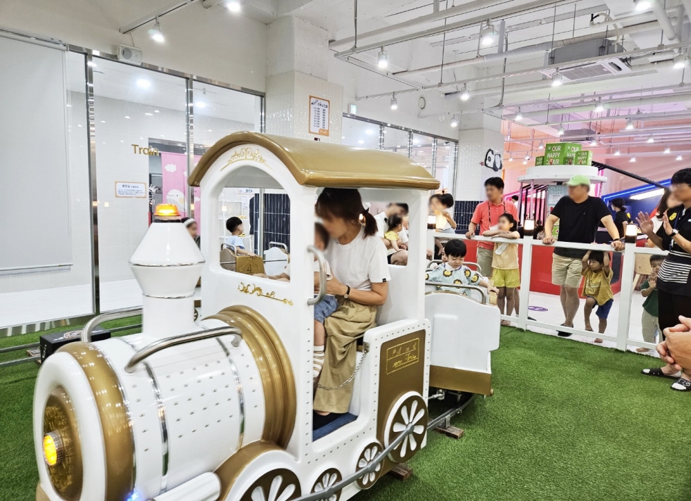 중앙에 위치해 있는 기차는 시간에 맞춰 출발하는데 안내방송이 나오면 가셔서 줄 서서 타시면 됩니다. 기차 타는 시간이 되면 모든 아이들이 다 모이는 것 같아요. 그래서 빨리 줄을 서시는 것이 좋습니다.