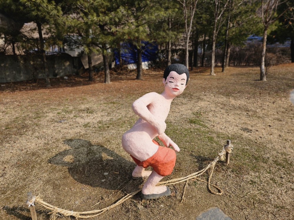 주차를 하고 들어오면 공원이 보이는데 공원에 조각동상들이 많아 구경하는 재미가 있어요. 옛날초가집 뒷간 체험도 가능하고 똥을 싸는 모습도 아주 리얼하게 보이면서 옛시대를 알 수 있는 키 쓴 아이라던 지 다양한 볼거리들이 많았습니다.