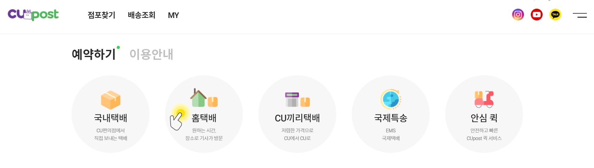 먼저 CU편의점택배 홈페이지에 접속 후 위 이미지와 같이 [홈택배] 부분에 마우스커서를 옮겨 클릭하여 줍니다.