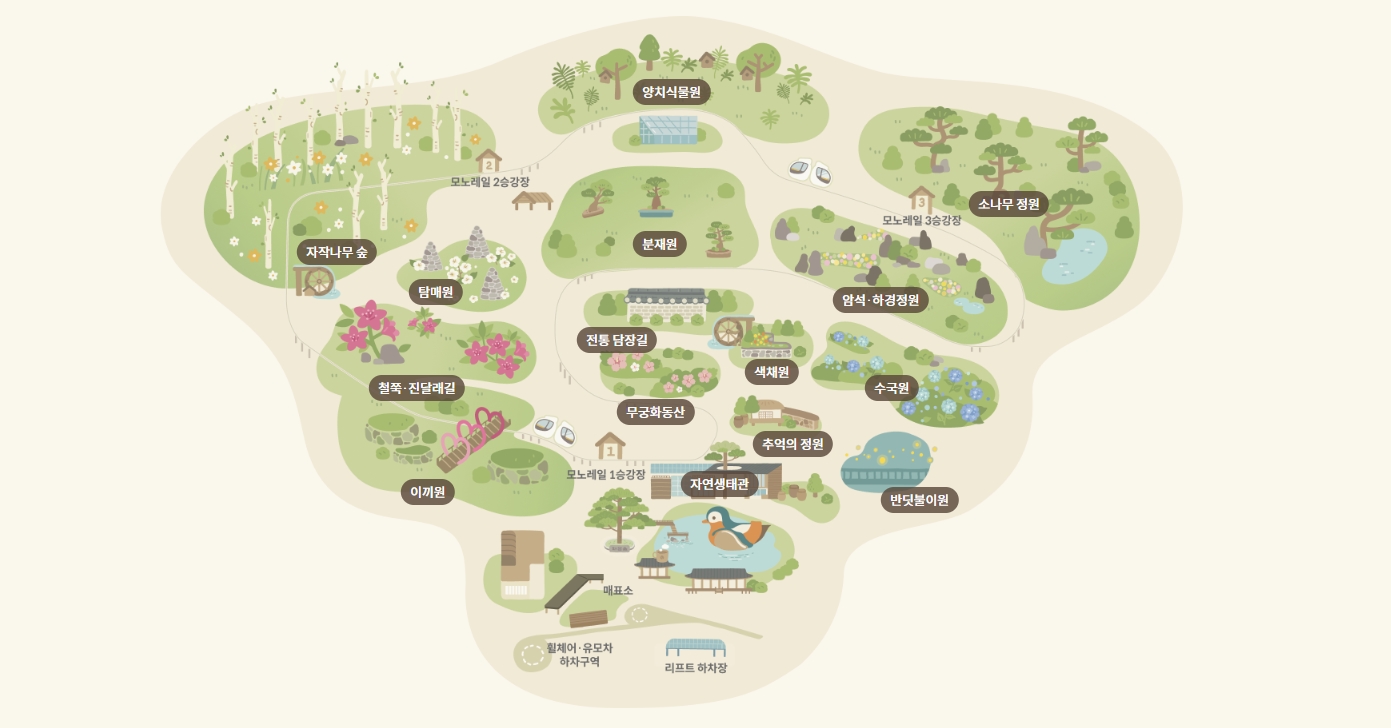 - 소나무 정원 - 소나무가 주인공인 정원으로 국내 최대규모의 소나무 정원으로 전국에서 수집된 명품 소나무 약 1,300그루가 식재되어 있는 곳입니다.