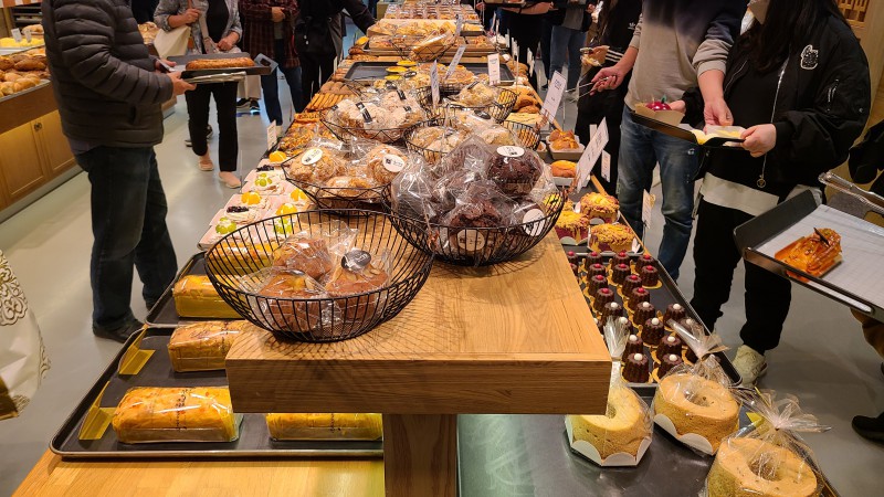 혜경궁베이커리는 1층 과 2층 그리고 외 총 3곳으로 구성이 되어있는데요. 1층 입구에 들어서면 빵이 진열되어 있습니다. 빵을 선택하신 후에 1층에서 결제하여 2층에서 픽업 후 이용해 주시면 됩니다. 이때 1층에서 고른 빵은 바로 가져가시면 되고 빵 커팅도 부탁드리면 해주니 빵커팅이 필요하신 분들은 사전에 요청하시는 게 좋을 것 같아요. 손님이 굉장히 많았습니다. 그리고 커팅 같은 경우 바게트류는 커팅이 가능하지만 일반 빵은 커팅이 불가능합니다.