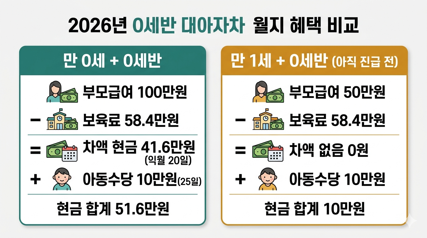A. 아이가 재원 중인 반(0세반) 기준의 보육료(58만 4천원)가 적용됩니다. 아이의 만 나이가 아닌 편성된 반이 기준입니다. 따라서 만 1세인데 0세반에 다니고 있다면 58만 4천원이 적용되며, 부모급여(50만원)보다 보육료가 많아 차액 현금은 없습니다.