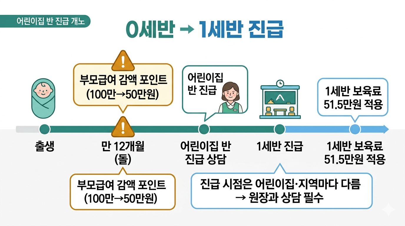 0세반에서 1세반으로 진급하는 시점이 부모님들이 가장 헷갈려하는 부분입니다. 만 나이가 됐다고 바로 1세반으로 옮기는 것이 아닙니다.