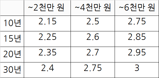 금리 조건으로는 연 소득 2천만 원 이하 30년일 경우 2.40% , 연 소득 4천만 원 이하 30년일 경우 2.75%, 연 소득 6천만 원 이하 30년 3.00%이며, 우대금리도 적용받을 수 있는 만큼, 2% 금리로 이용을 할 수 있습니다.