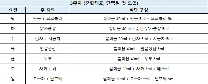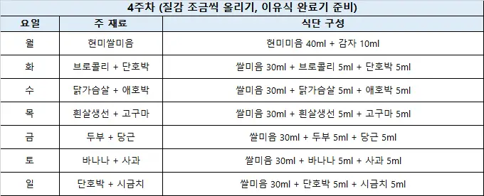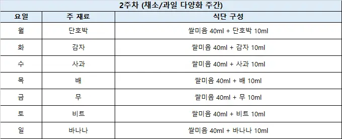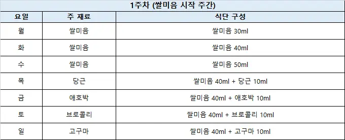 6개월 아기 이유식 식단표(초기 1단계 / 1~4주 차)