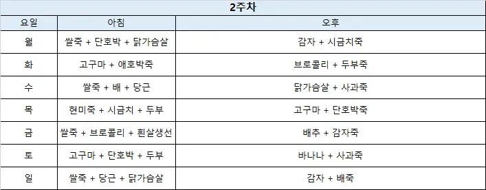 - 동물성: 닭가슴살, 흰살생선(도미, 대구 등), 노른자