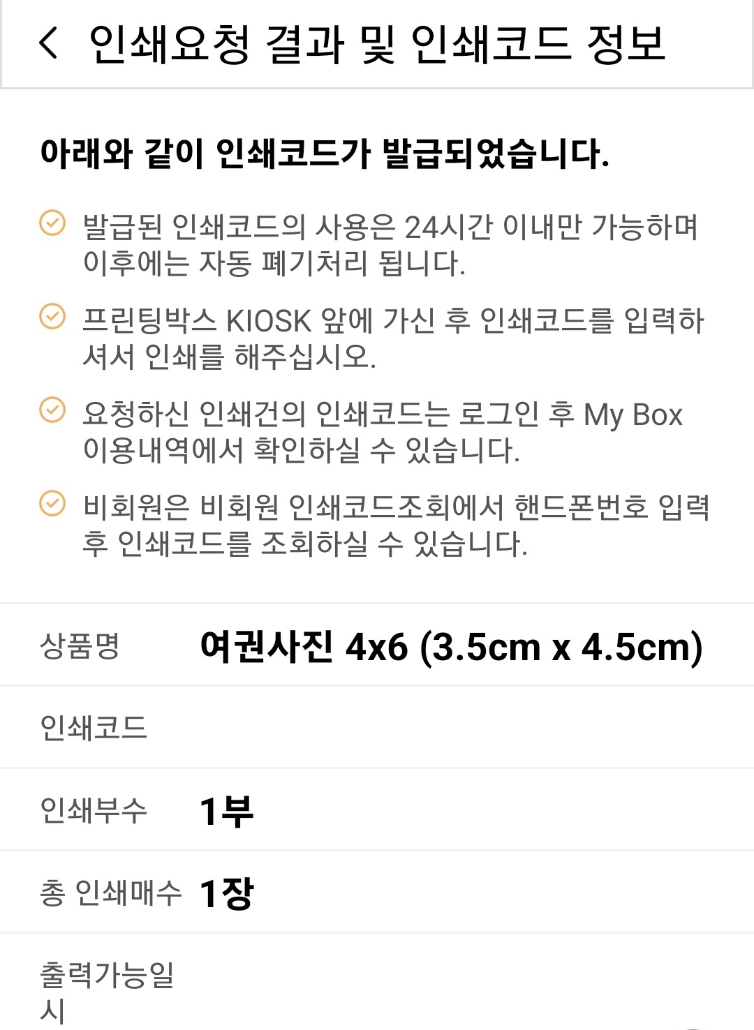 - 발급된 인쇄코드를 들고 가까운 기기에서 코드를 입력한 뒤 결제하면 출력이 끝납니다