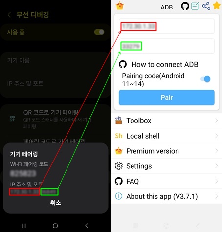 - 위 1,2번을 다 하셨다면 아까 설치한 ADB 어플을 실행해주세요. 어플을 실행 후 위 이미지처럼 위에 칸에 기기 페어링 IP 주소를 입력 그리고 아래칸에는 기기 페어링 포트를 입력하여 Pair 클릭하여 줍니다.