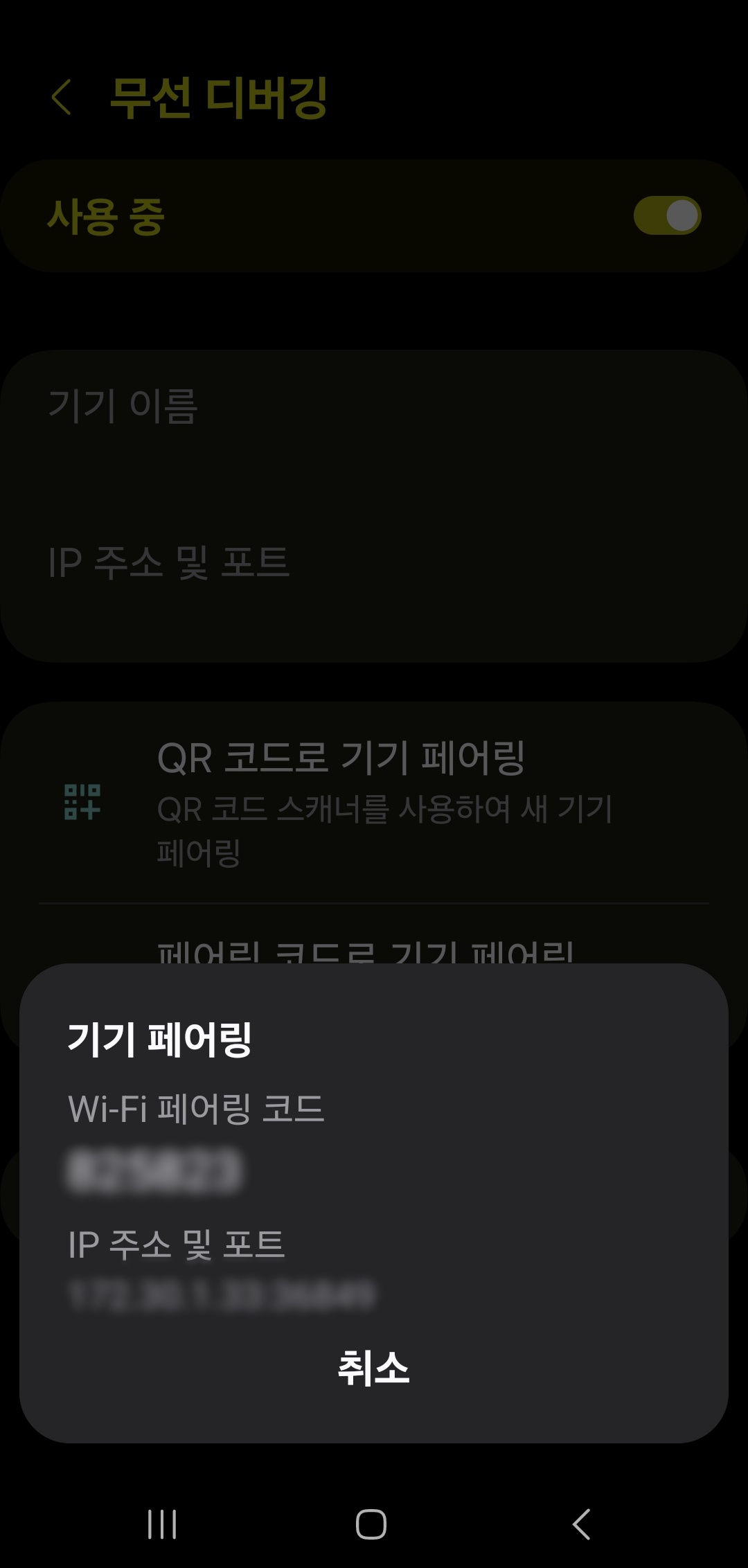 - [개발자옵션] - [무선 디버깅] 클릭 후 [무선 디버깅]은 사용 중으로 변경하여 아래 [페어링 코드로 기기 페어링]을 클릭하여 줍니다. 이때 위에 이미지처럼 기기 페어링 이란 화면이 뜨는데 이때 기기 페어링에 뜨는 와이파이 페어링 코드 와 IP 주소 및 포트는 사용하셔야 되는 번호로 알고 계셔야 됩니다. 따로 메모를 해주시거나 팝업화면 또는 분할화면으로 작업해 주시면 됩니다.