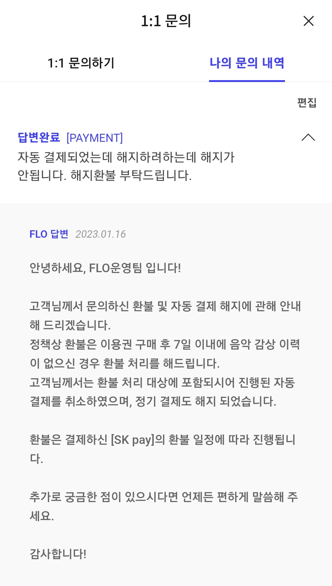 - 앱에서 1:1 문의로 flo 정기 결제 해지 요청을 남기는 방법